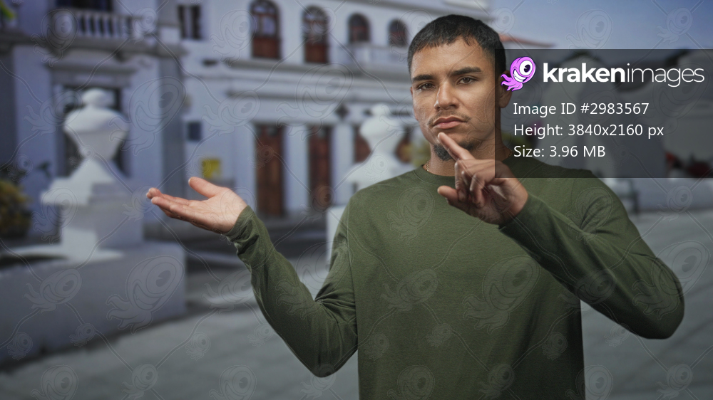 Man presenting open palm and pointing finger toward empty space in front of a white historic building on a pedestrian street plaza; thoughtful.