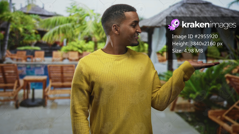 Man presenting palm up at building pool cabana wearing yellow sweater, palm extended in gesture of offering; welcoming calm.