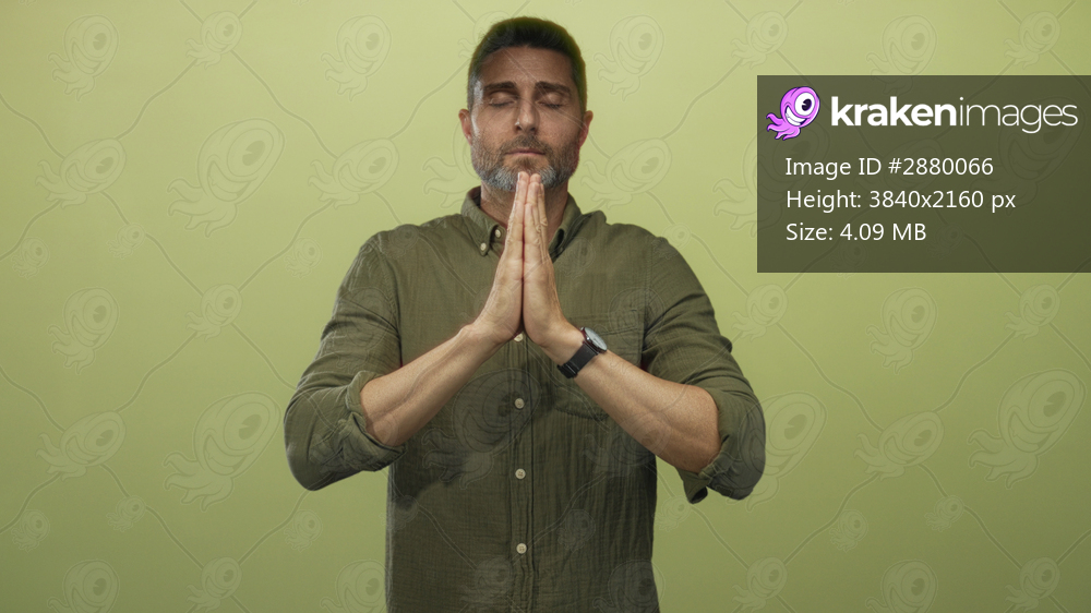 Man with pressed palms prayer gesture and closed eyes in studio against green backdrop; serenity mindfulness reflection.