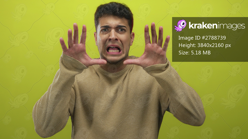Man presses face with cringing gesture against a colored background and shows young male hispanic features with wince reflex in his hands and intense expression. - Kraken Images