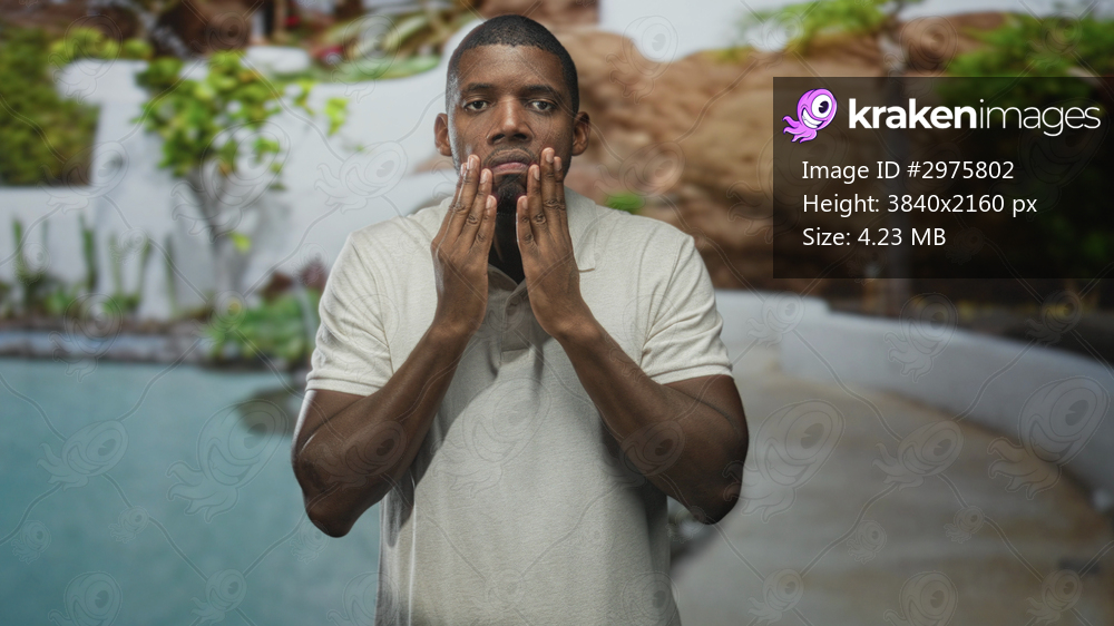 Man presses hands to face and cheeks while looking tense in studio set by a pool; concern reflection.