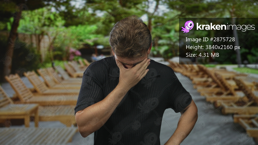 Man presses hands to face in outdoor poolside area with wooden lounge chairs and trees on a street walkway; distress.