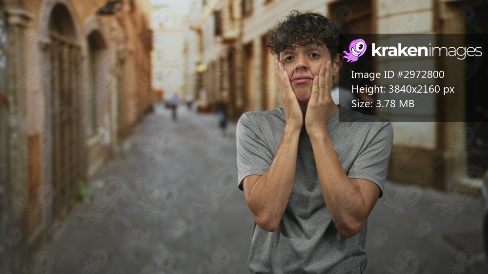 Man presses hands to head, covering ears and face while standing alone on a narrow cobblestone street; anxiety solitude.