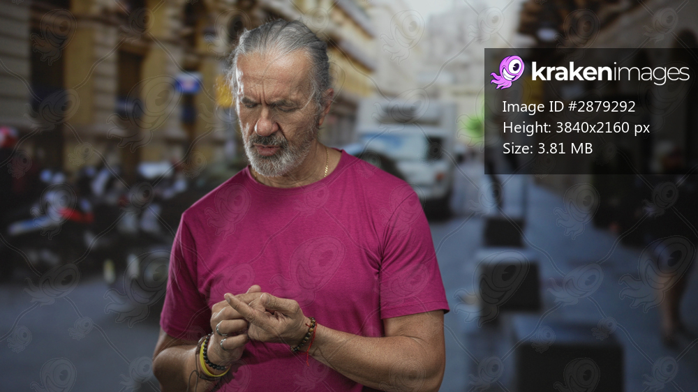 Man presses his fingers together on a busy city street beside a taxi and delivery van; concern reflection.