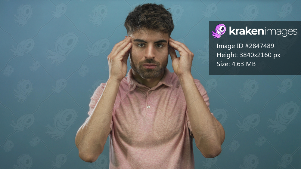 Man presses temples and closes eyes in blue studio with stubble beard, furrowed brow and tilted head; stress.