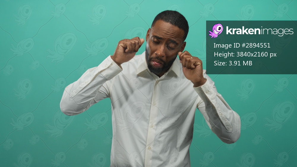 Man pressing fists to ears and closing eyes in studio with teal backdrop wearing white shirt; frustration noise reaction.