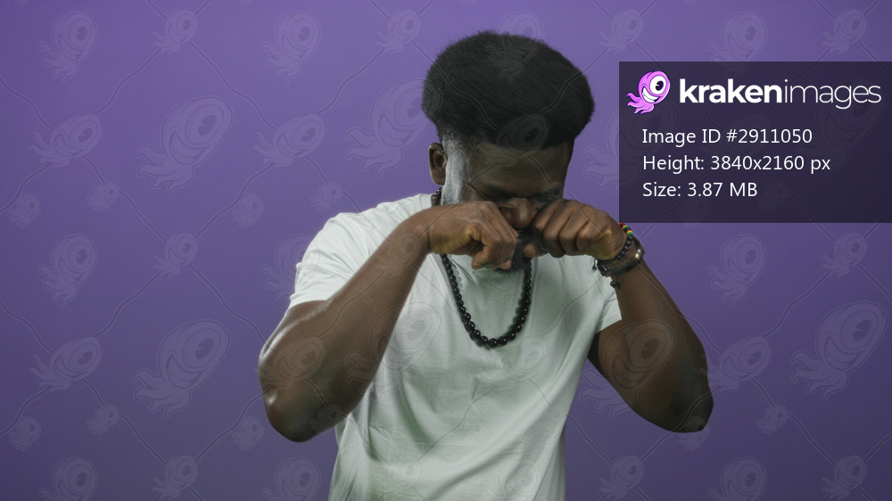 Man pressing fists to eyes and rubbing face in studio against purple wall, wearing white tshirt and beaded necklace; tiredness reflection.