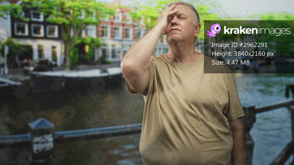 Man pressing hand to forehead beside canal railing, eyes closed, holding forehead in a headache gesture on a city street lined with canal houses; fatigue contemplation. - Kraken Images