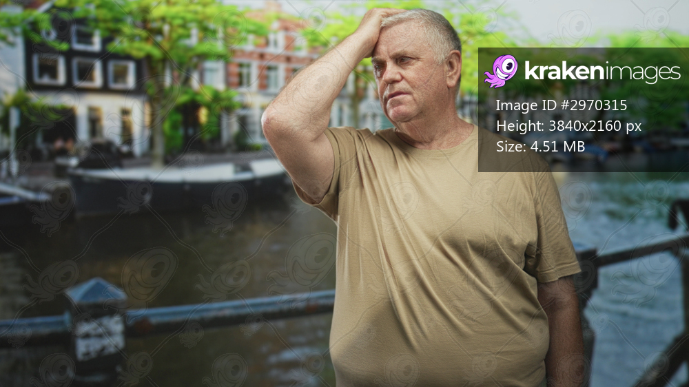 Man pressing hand to forehead beside canal railing, eyes closed, holding forehead in a headache gesture on a city street lined with canal houses; fatigue contemplation. - Kraken Images