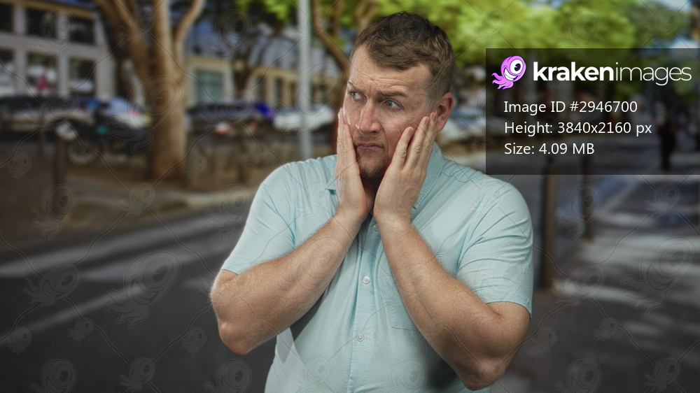 Man pressing hands to cheeks on a busy street near parked cars and trees, looking puzzled; confusion decision making.