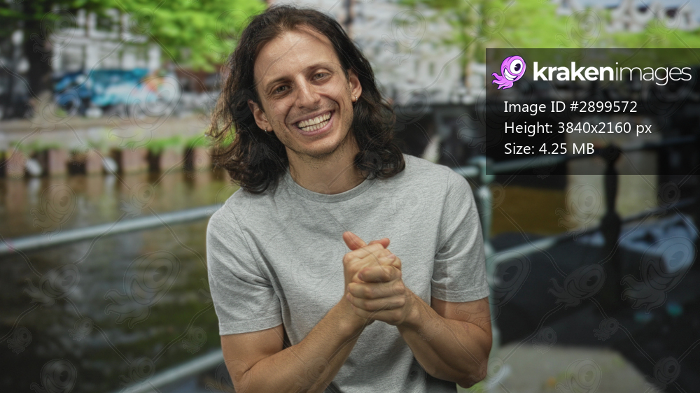 Man pressing hands to cheeks on street by an amsterdam canal railing, smiling with long hair and visible forearms; joyful moment.