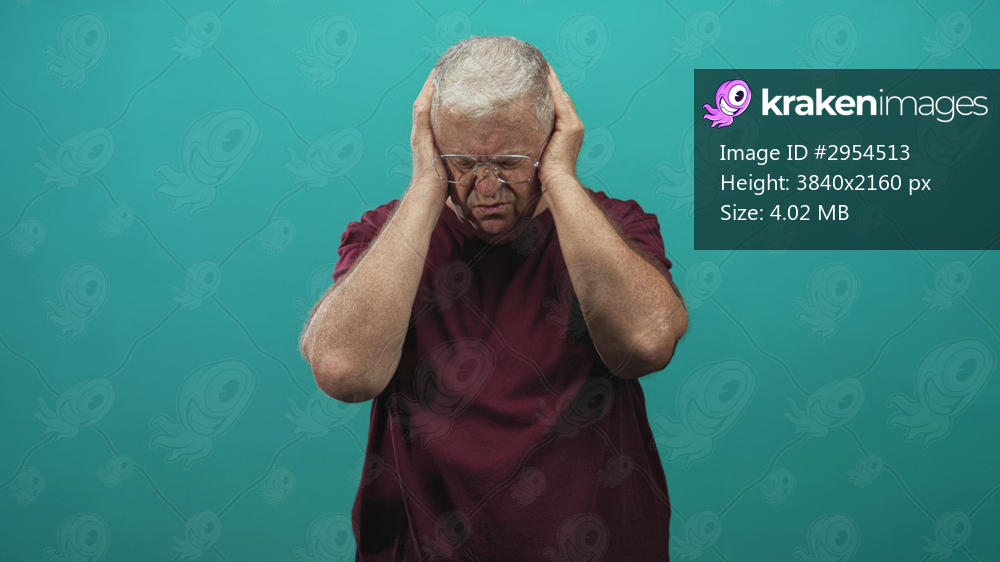 Man pressing hands to ears and wincing, wearing glasses and burgundy shirt in studio; pain isolation.