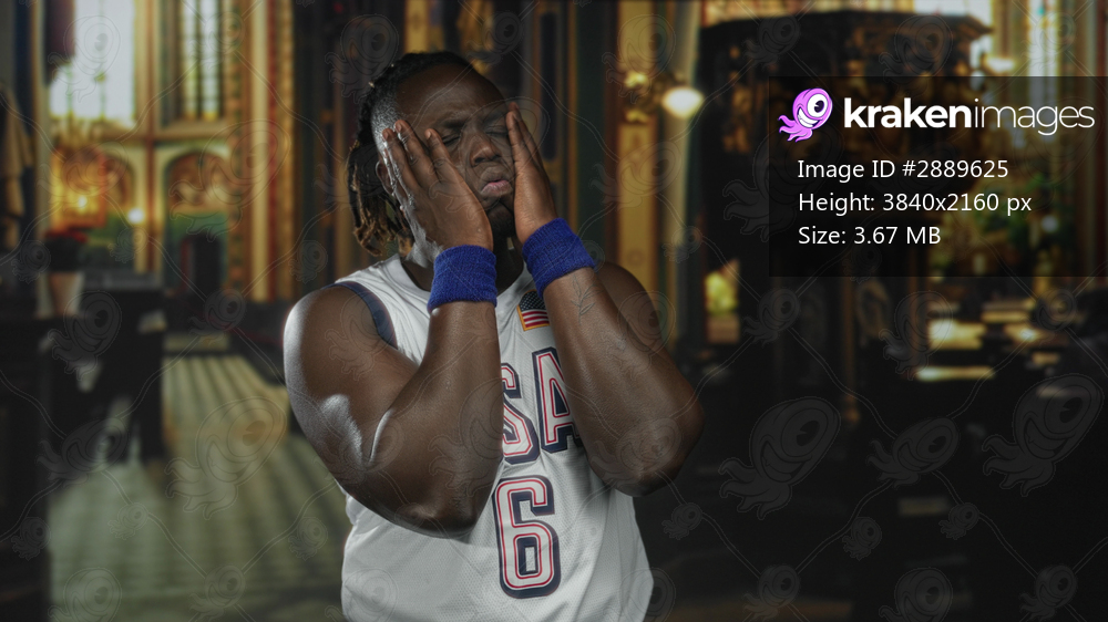 Man pressing hands to face in a church building, wearing usa jersey and wristbands, eyes closed and palms cupping cheeks; devotion solace.