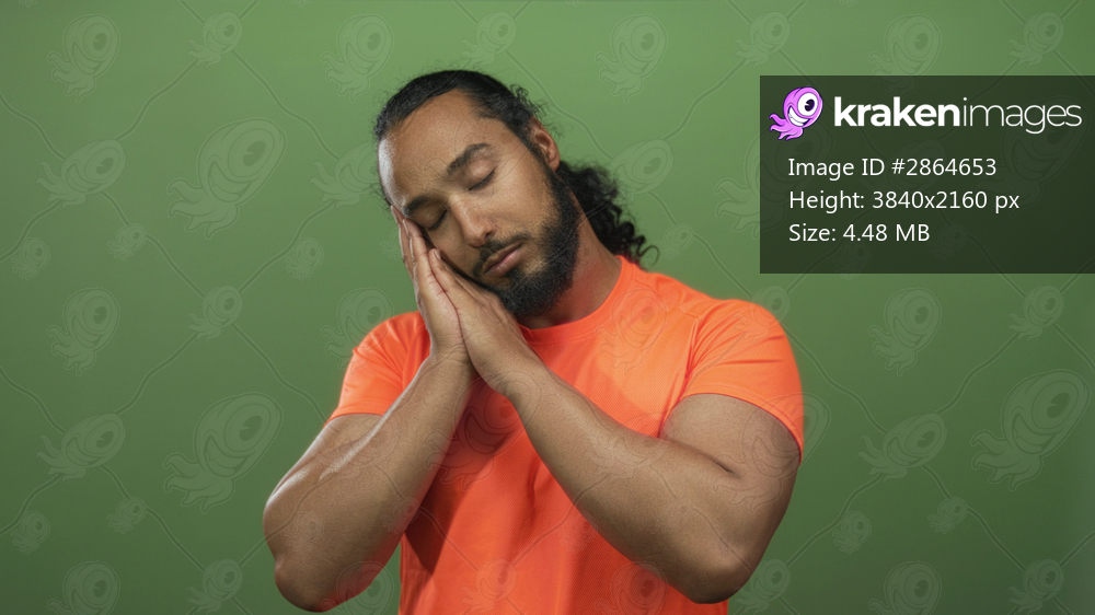 Man pressing hands to face in a sleeping pose on a green studio set with closed eyes and relaxed posture; rest calm.