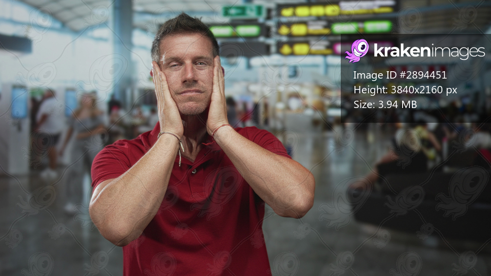 Man pressing hands to temples in crowded airport terminal near departure board wearing red polo shirt and bracelet; travel stress.