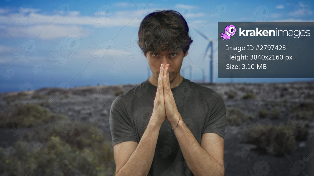 Man pressing hands together and looking down near a row of windmills in forest landscape; calm reflection.