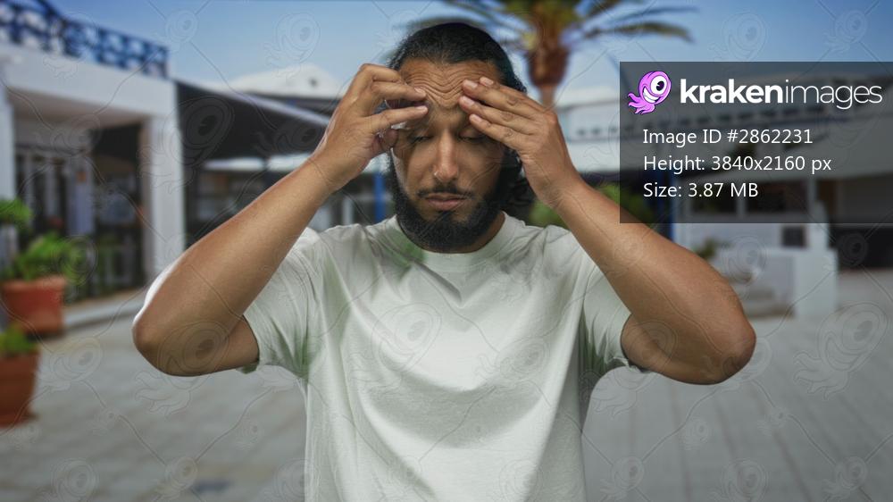 Man pressing his temples and wincing while standing on a sunny street by a white building and palm tree; migraine pain.