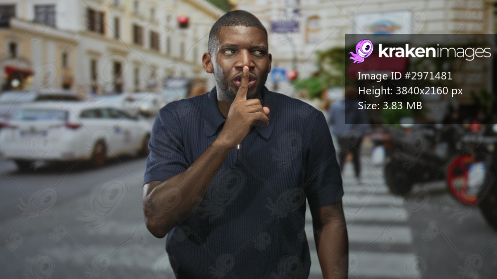 Man pressing index finger to lips for silence on a busy street crosswalk near cars and motorcycles; quiet secretive.