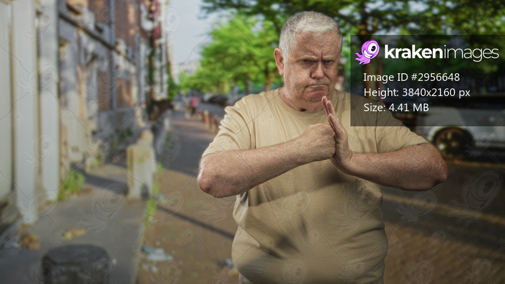 Man pressing palms together with clenched fist near chest, visible hands and stern face on a street lined with trees and parked cars; serious determination. - Kraken Images