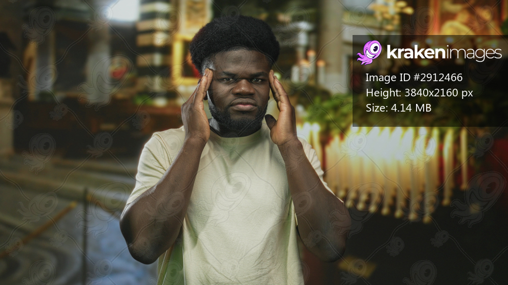 Man pressing temples with both hands inside a church building, eyes closed and grimacing in pain and concentration; spiritual pain.