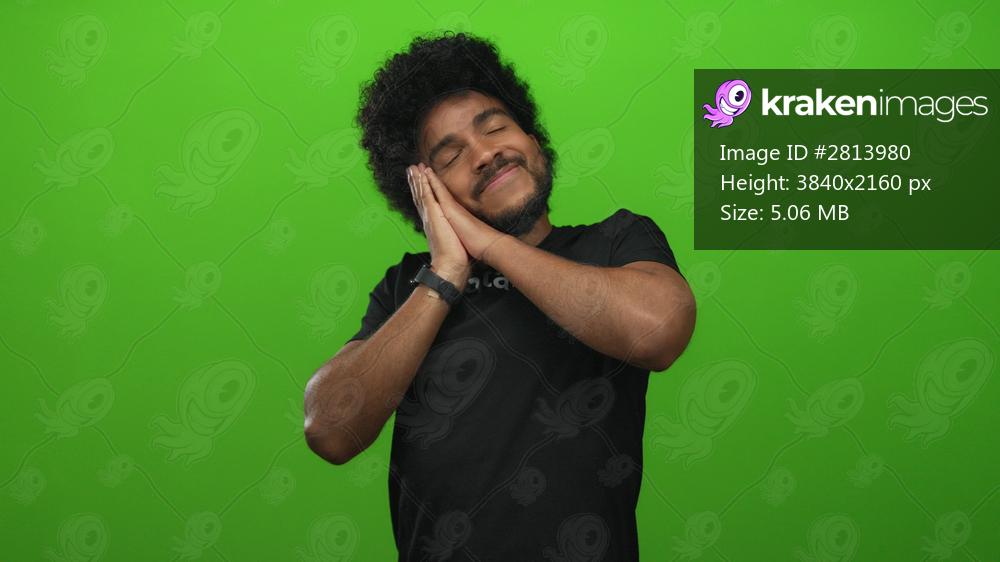 Man pretending to sleep in front of a vivid green background, expressing relaxation and contentment with hands together near face, wearing casual black attire. - Kraken Images