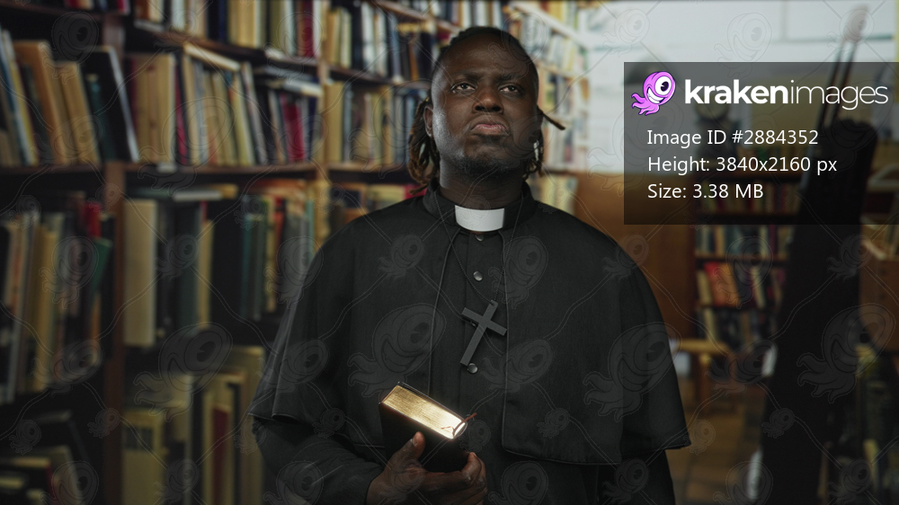 Man priest holding an illuminated book in one hand, wearing a clerical collar and large cross, looking upward among tall bookshelves inside a library building; faith contemplation. - Kraken Images