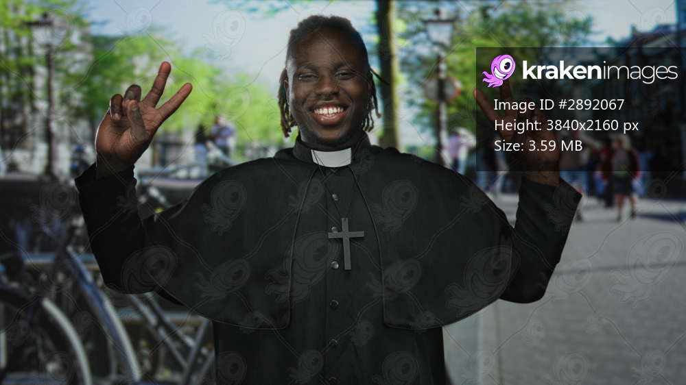 Man priest in cassock holds up peace sign with both hands on a busy street; joy faith community hope.