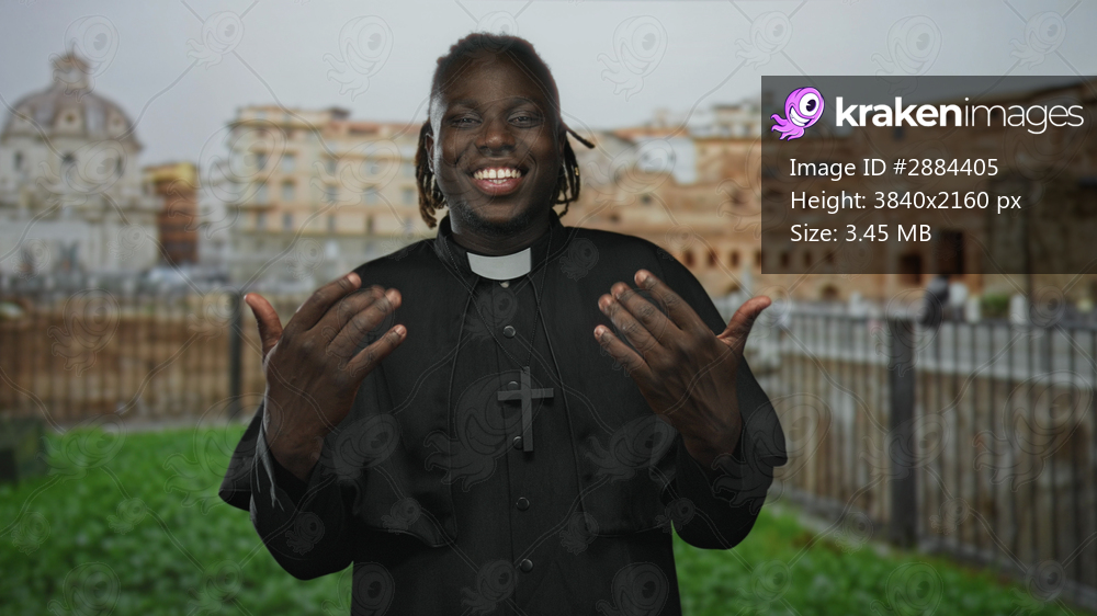 Man priest smiling with hands raised in front of an ancient building at roman ruins; joy faith welcome.
