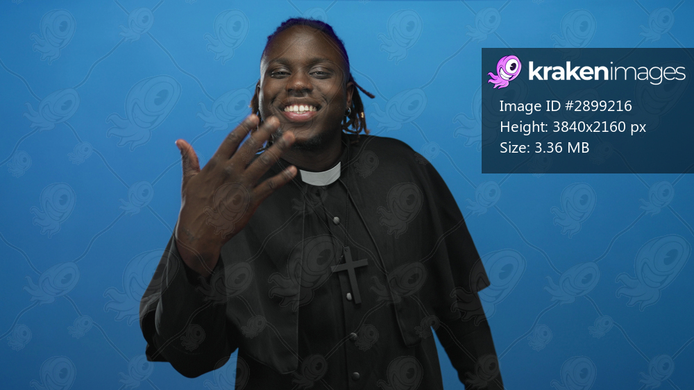 Man priest smiling and offering hands showing cross pendant in blue studio speaking to camera; joy faith welcome.