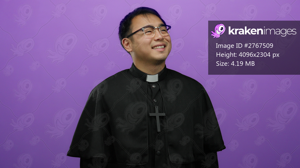 Man priest smiling wearing black robe and cross necklace with glasses against vibrant purple background representing religious theme