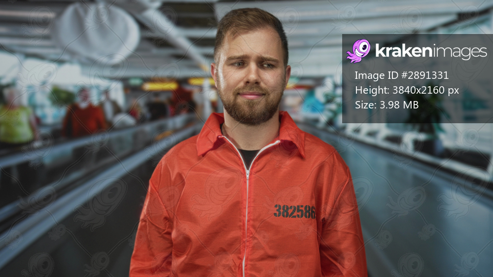 Man prisoner with beard in orange jumpsuit standing in airport terminal, frowning and looking sideways; unease.