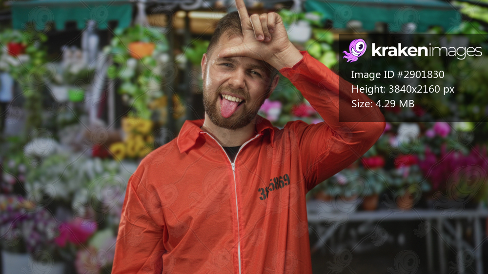 Man prisoner in orange jumpsuit forms l hand sign and sticks out tongue at flower market; playful defiance.