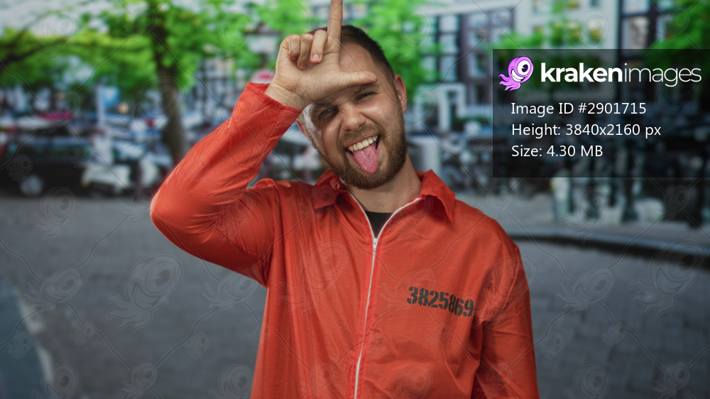 Man prisoner in orange jumpsuit makes l sign to forehead and sticks out tongue on street; mockery defiance.