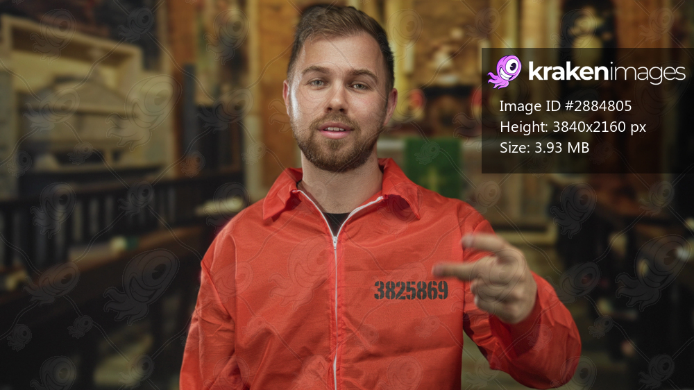 Man prisoner in orange jumpsuit numbered 3825869 pointing finger toward camera inside church building; redemption faith.