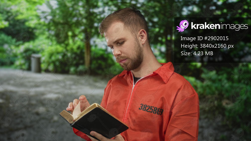 Man prisoner in orange jumpsuit reading book turning page in forest; contemplation reflection study solitude.
