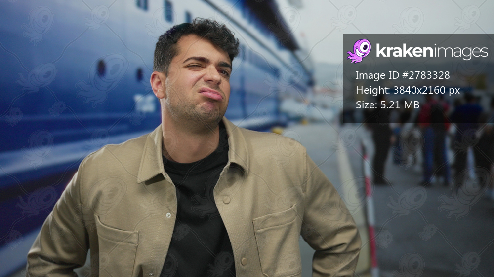 Man props chin then leans on ship at port while hispanic male tourist plans travel on cruise.