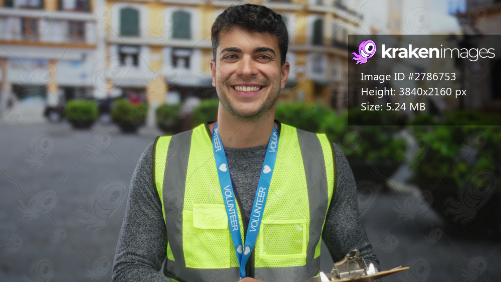 Man props hand on a clipboard while writing notes along a street with hispanic young volunteer guy exploring downtown urban areas.