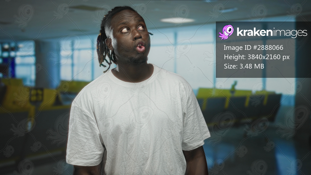 Man with pucker mouth looking up in airport terminal wearing white tshirt and dreadlocks, standing near seats and windows; surprise curiosity.