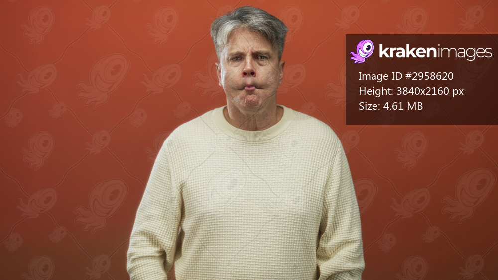 Man puffing cheeks with puckered mouth and visible face, wearing cream sweater against orange studio backdrop; playfulness.