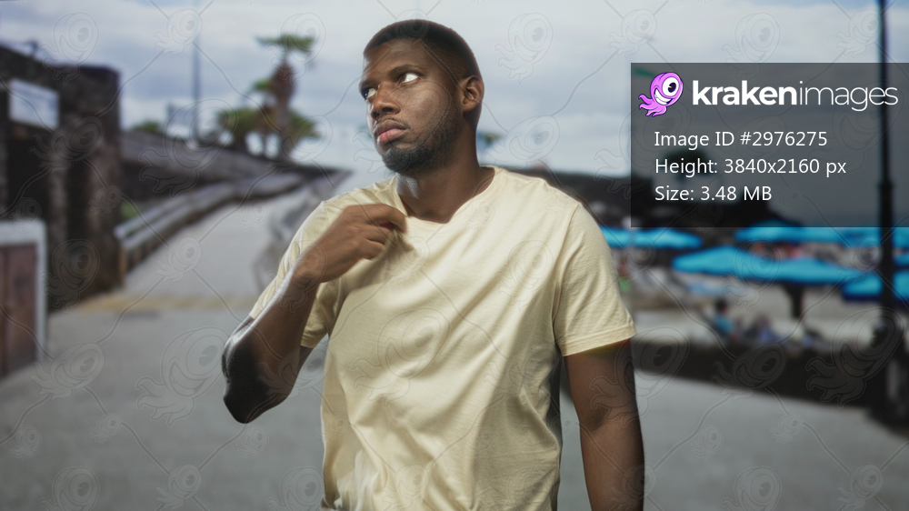 Man pulls shirt at neck, exposing part of chest and wearing a tense expression on a beachside street lined with umbrellas and palm trees; discomfort.