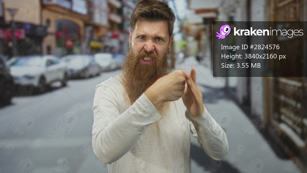 Man punching with clenched fists in a narrow urban street flanked by buildings and parked cars; anger aggression conflict frustration.