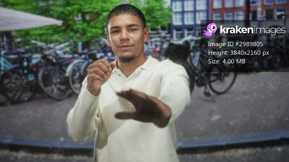 Man punching fists toward camera among parked bicycles on a city street wearing white sweater; confidence.
