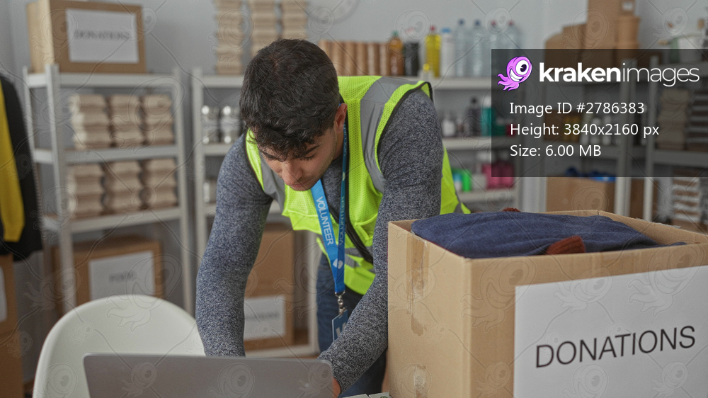 Man pushes box while carrying supplies across warehouse with young hispanic volunteer organizing donations and a guy checking numbers on computer.