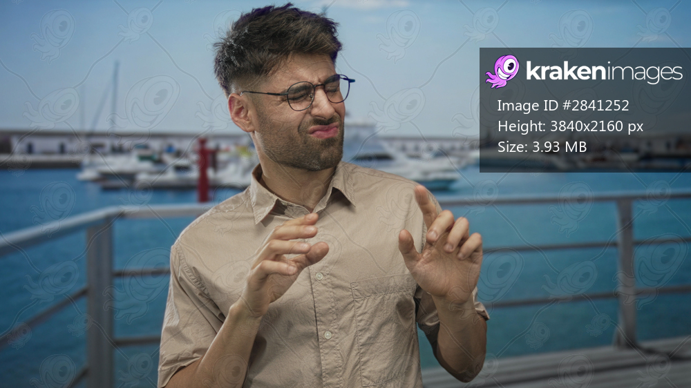 Man pushes open palms away with disgusted expression by white boat on harbor dock at sunny port marina; disgust.