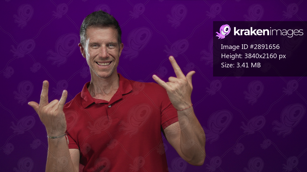 Man with raised bare hands making rock horns gesture and smiling in a purple studio wearing a red polo shirt; joyful energy.