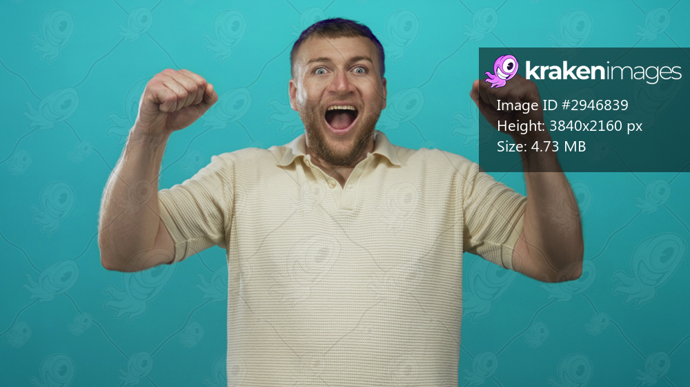 Man with raised fists and open mouth in studio with turquoise wall cheering toward camera, joyful expression; excitement victory.