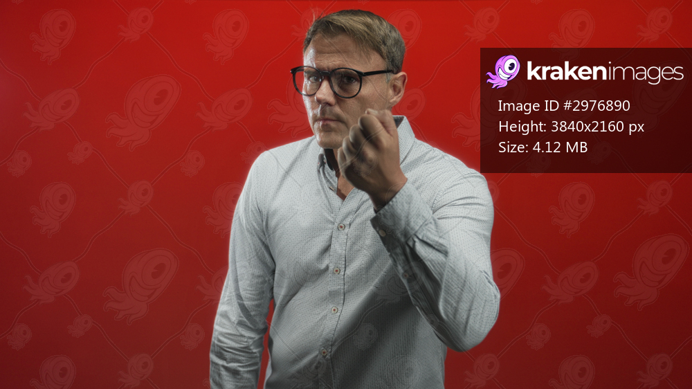 Man with raised hand beckoning toward camera, wearing glasses and white shirt in studio; confusion pondering.