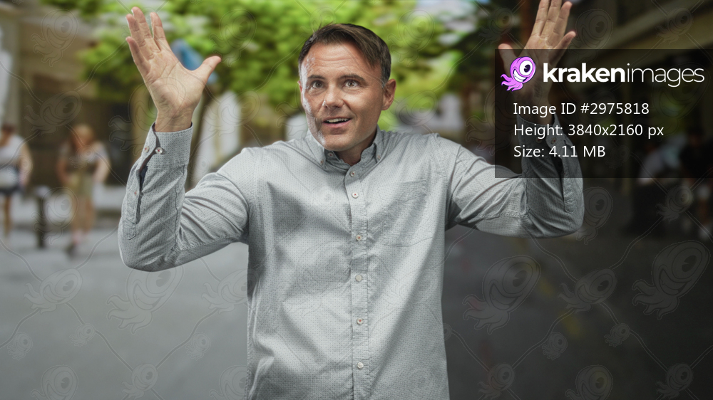 Man with raised hands and open mouth making a surprised gesture on a busy pedestrian street with storefronts, trees and blurred shoppers; surprise.