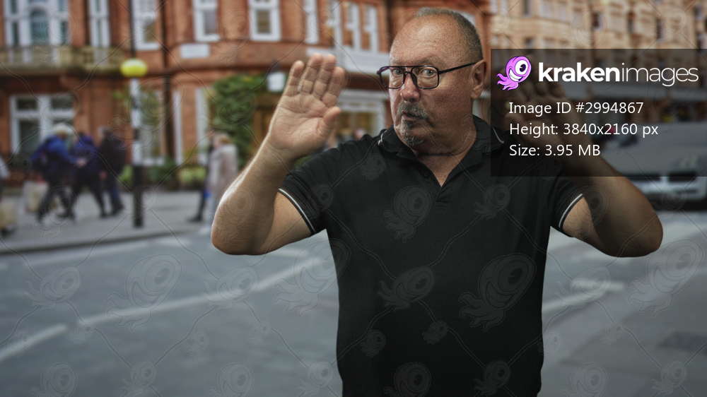 Man with raised hands palms out stopping a car and signaling pedestrians at a busy urban street crossing; public safety alertness.