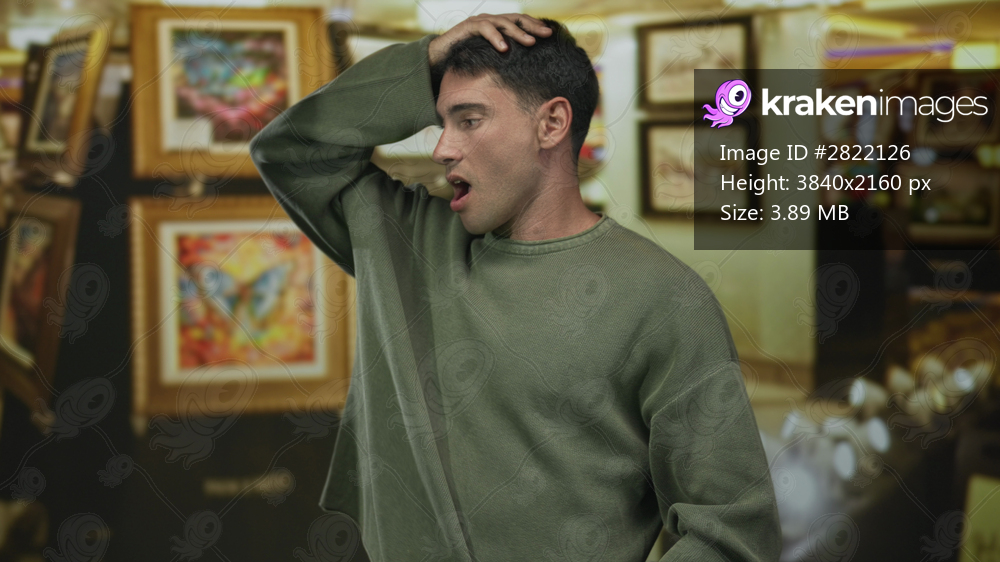 Man with raised left hand resting on head inside gallery building observing framed art on walls with surprised expression; surprise.